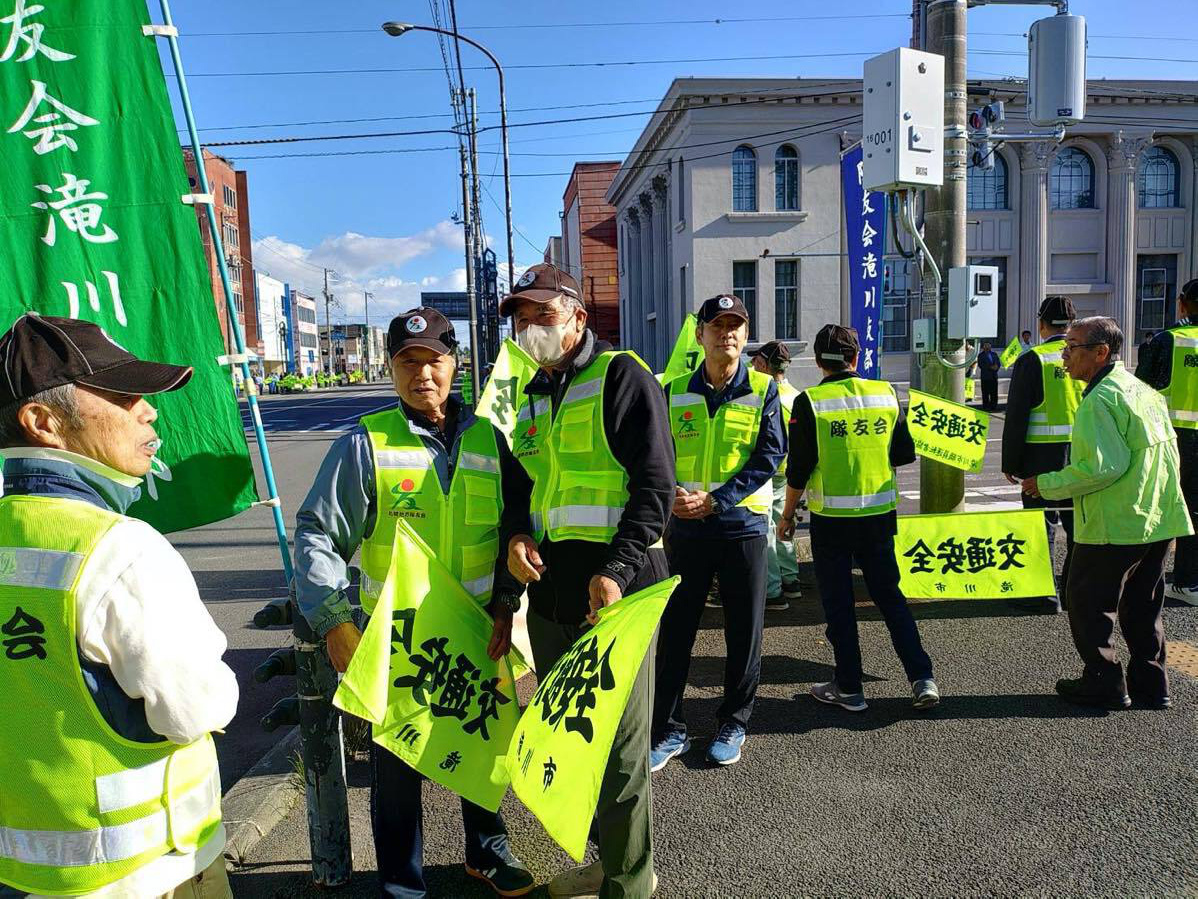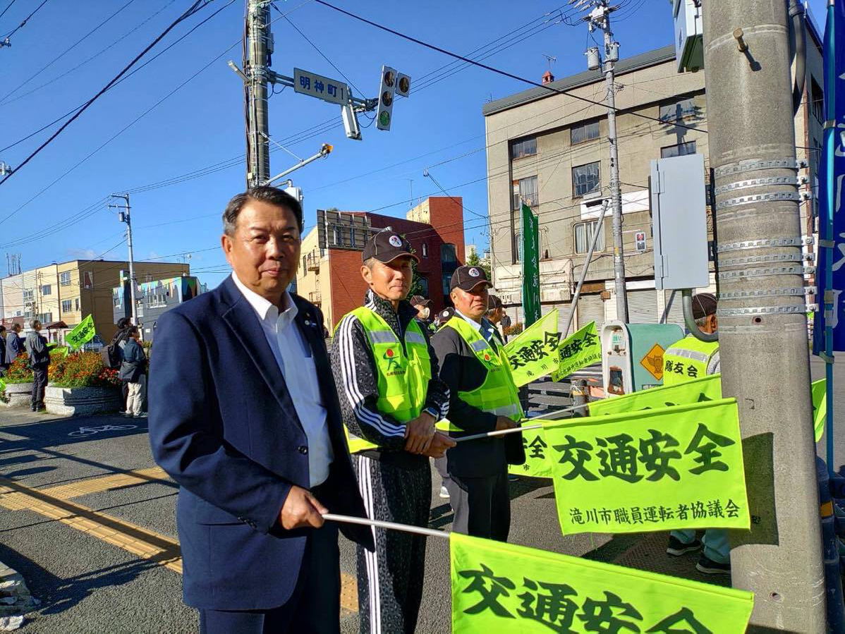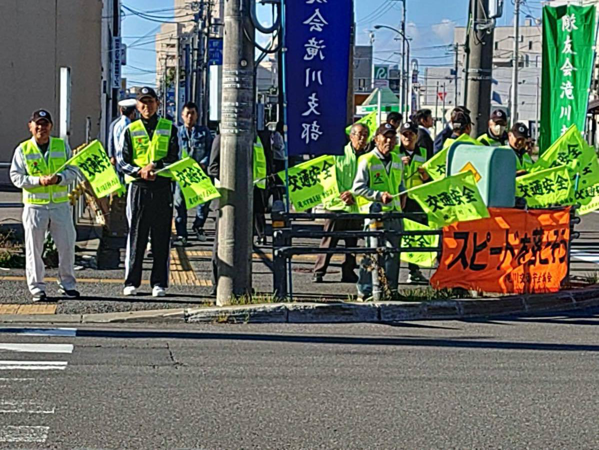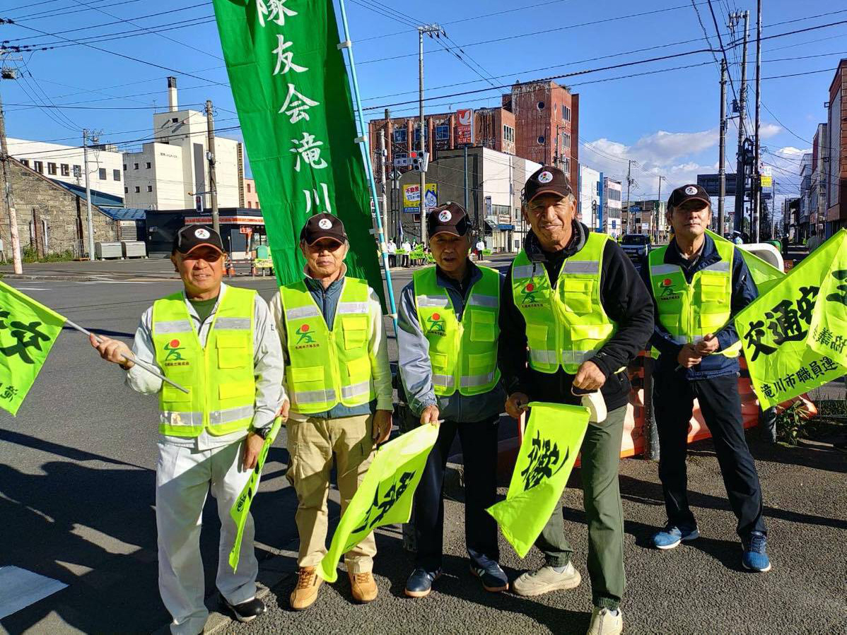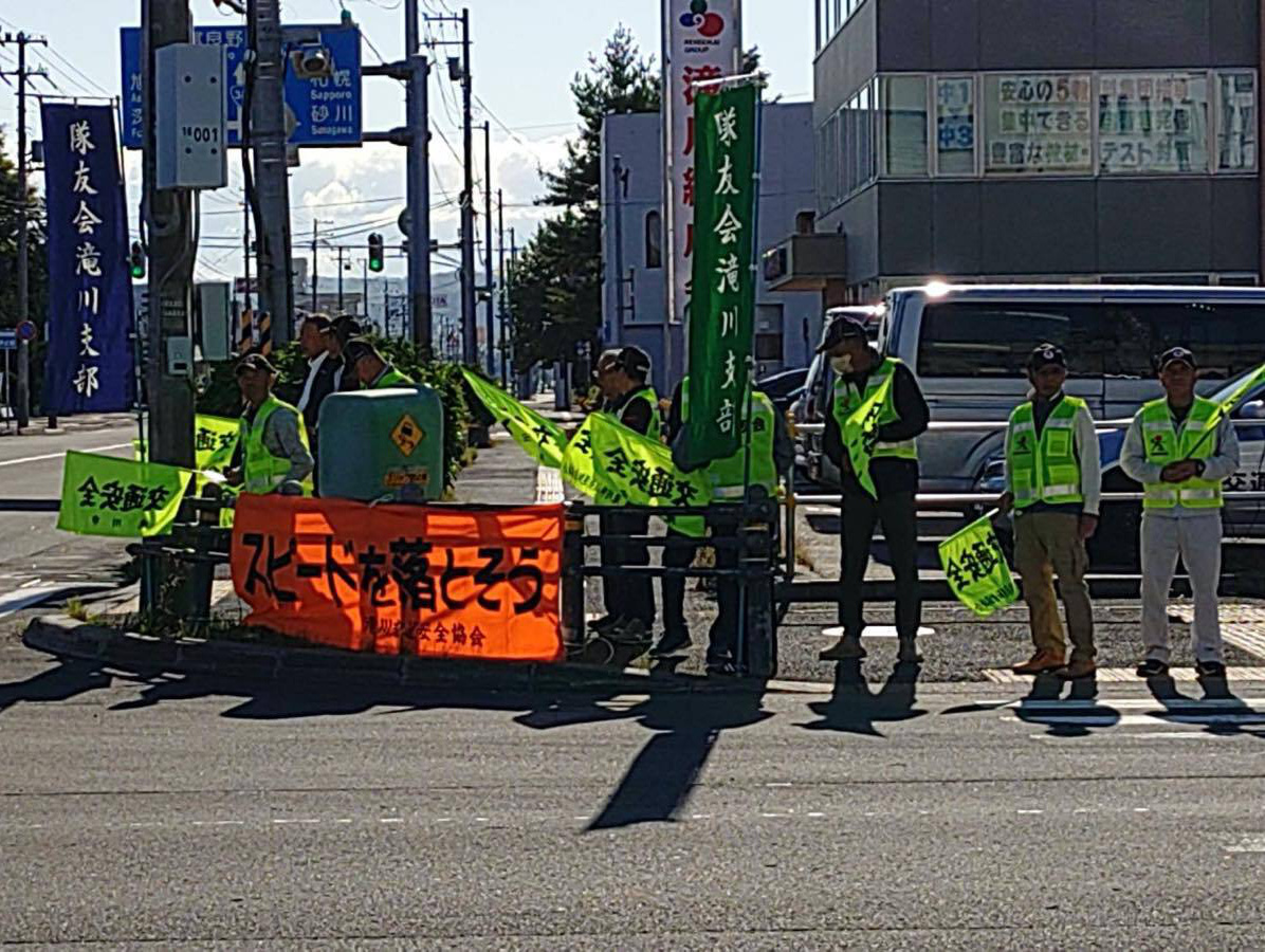 令和7年7年7月19日、秋の交通安全運動が始まりました。期間は9月21日〜9月30日までの10日間です。隊友会滝川支部は、19日早朝の出勤・通学時間帯に市内を通る国道12号線沿いに立ち並らび「飲酒運転・スポーどの出し過ぎ」など事故防止の声がけを行なった。